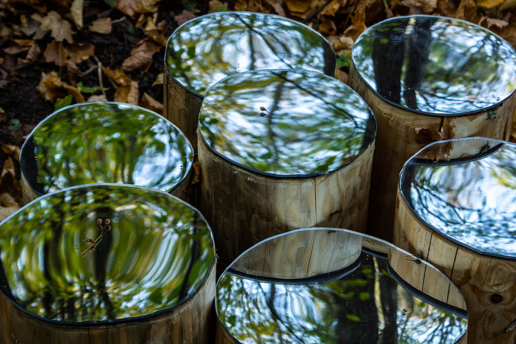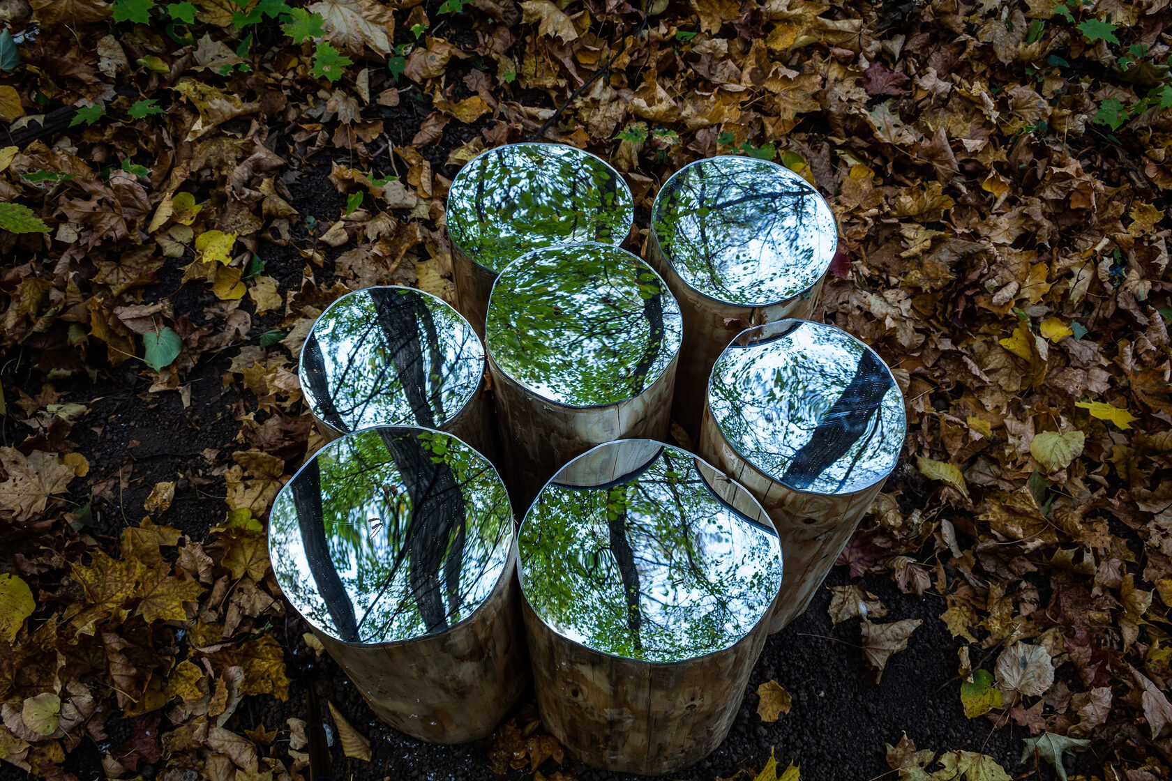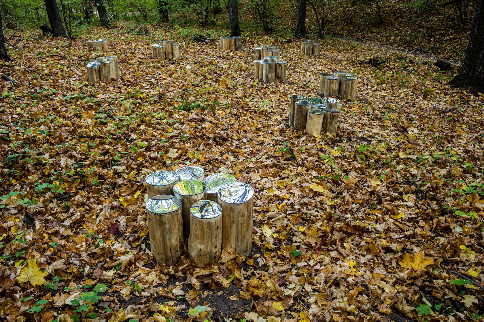 На одной из полян расположены пеньки с зеркальными поверхностями. Кому-то эти зеркала помогут почувствовать себя маленькой частью большой природы, другим станут просто эффектной фотозоной. Каждый посетитель может интерпретировать посыл этого арт-объекта по-своему и найти в нём что-то уникальное.