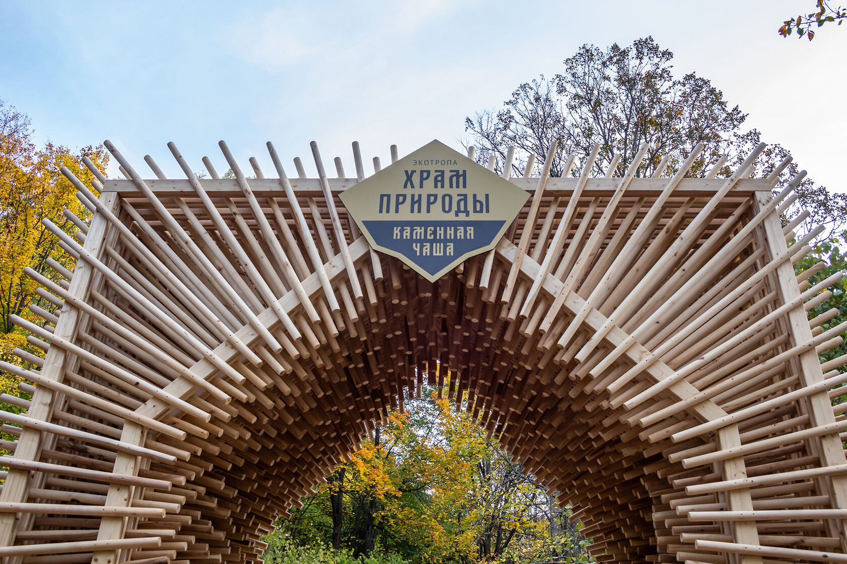 Путешествие начинается с величественных ворот с абрисом дома внутри и расходящимися в стороны «лучами». Это символическое напоминание о том, что природа — наш дом, и одновременно подчёркивание чудесности заповедного места. Пройдя через такие ворота, посетитель будто действительно попадает в храм природы.