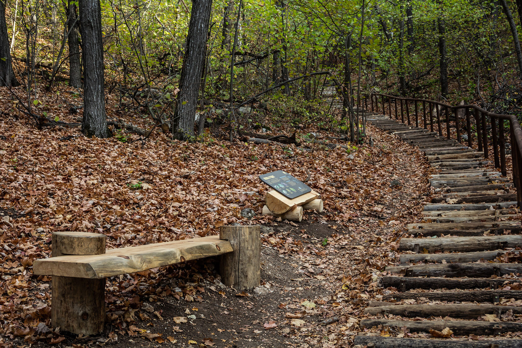 В частности, собранный в лесу валежник стал материалом для производства лестничного настила. Так подъём в гору стал более комфортным для посетителей, но не утратил своей природности.