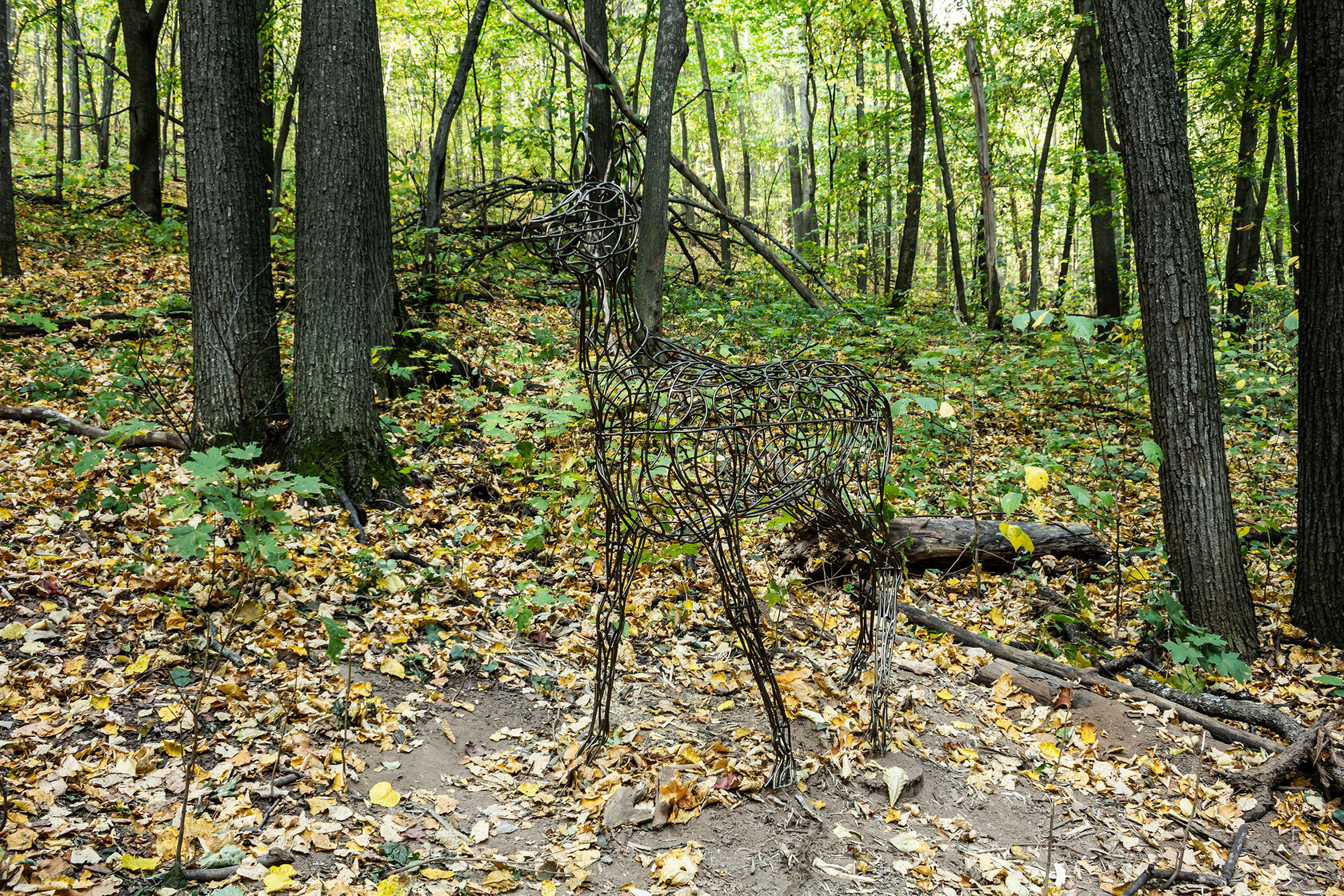 Перед началом крутого подъёма посетителей встречают скульптуры животных, выполненные из тонких металлических прутьев — это износостойкая и крепкая имитация лозы. Благодаря «кружевному» плетению, скульптуры выглядят воздушными, становятся частью лесного пейзажа.
