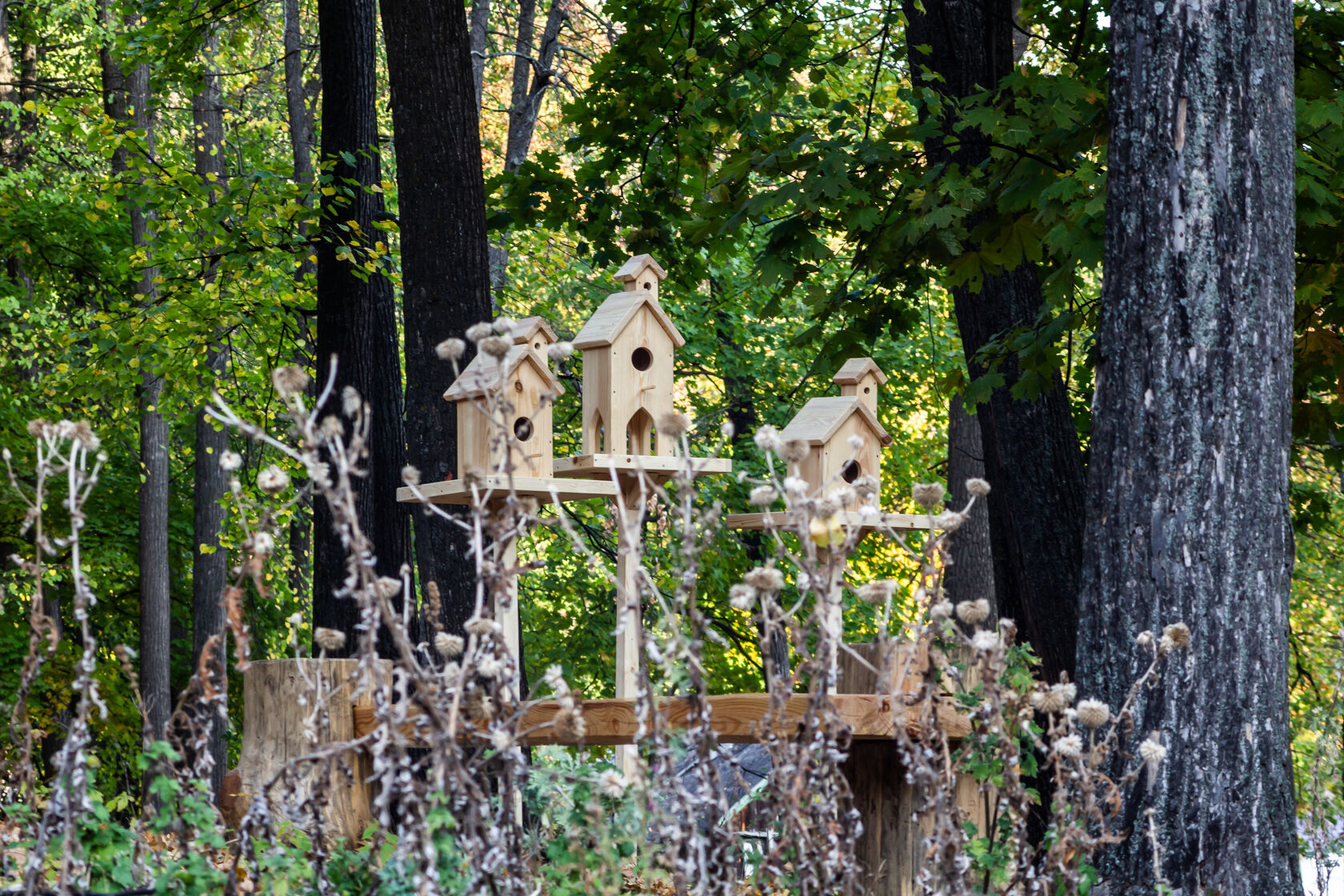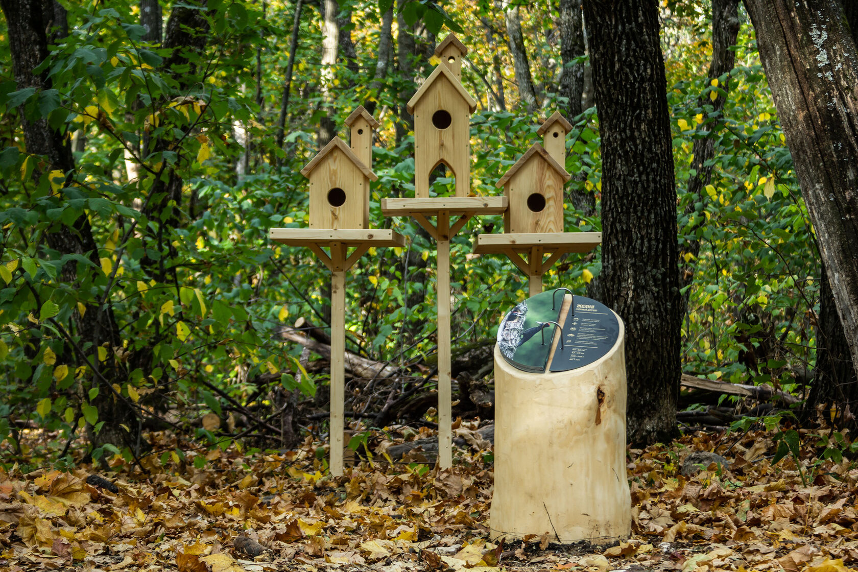 Среди леса можно полистать книгу-определитель и узнать об образах жизни, пищевых привычках и местах зимнего обитания местных пернатых и рукокрылых. Интерактив расположен рядом со скворечниками, где при большой удаче тоже можно встретить местных обитателей.