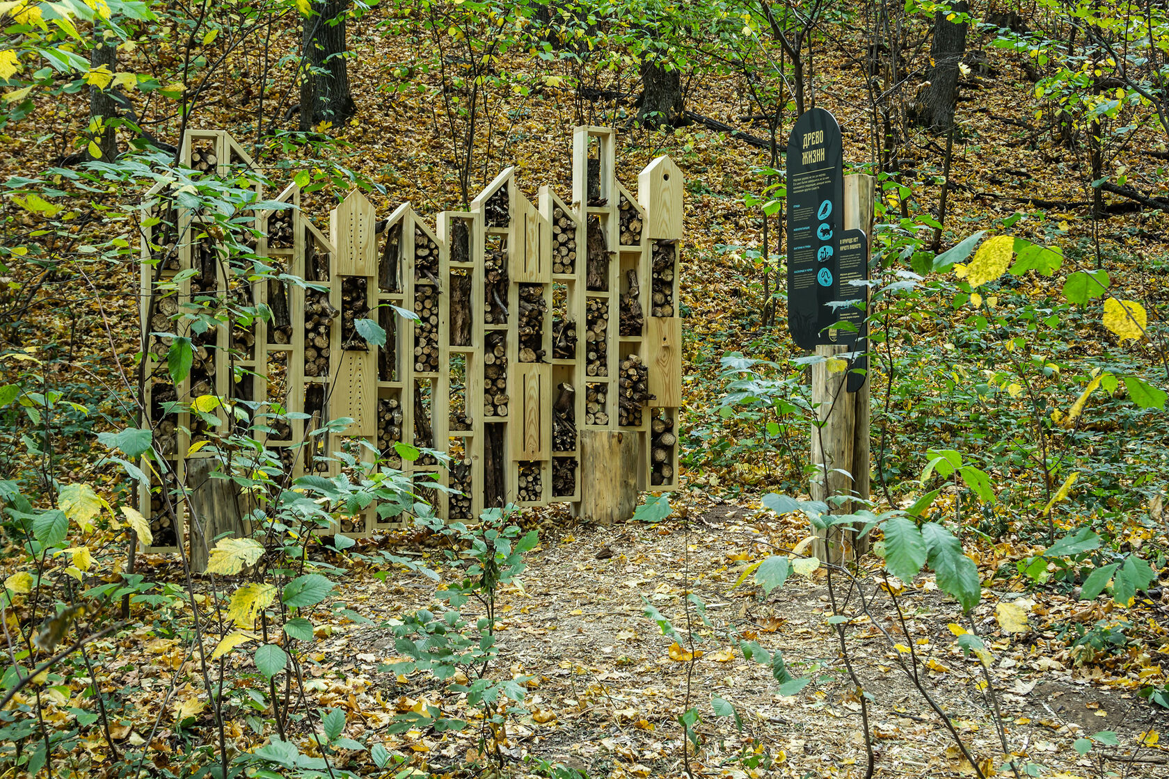 Встретить животных на тропе почти невозможно, так как она довольно проходимая. Однако чтобы подчеркнуть смысл «Храма природы» и показать, что здесь действительно есть жизнь, мы создали «Жукарий». Все ячейки этого домика мы заполнили разными текстурами: корой, брёвнышками, трухой, в отдельных из них просверлили отверстия разной формы.