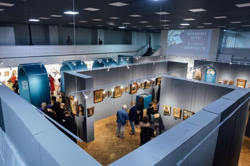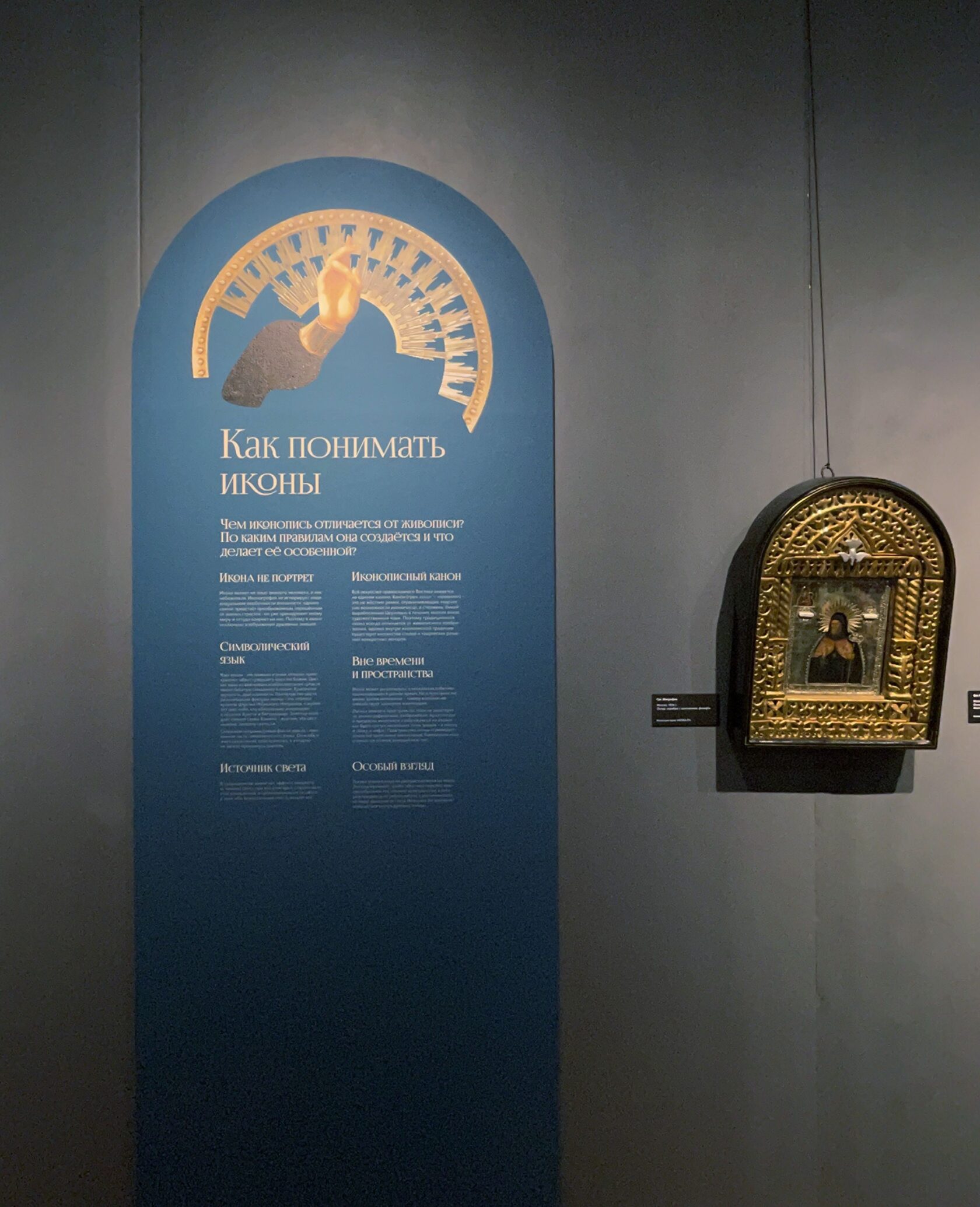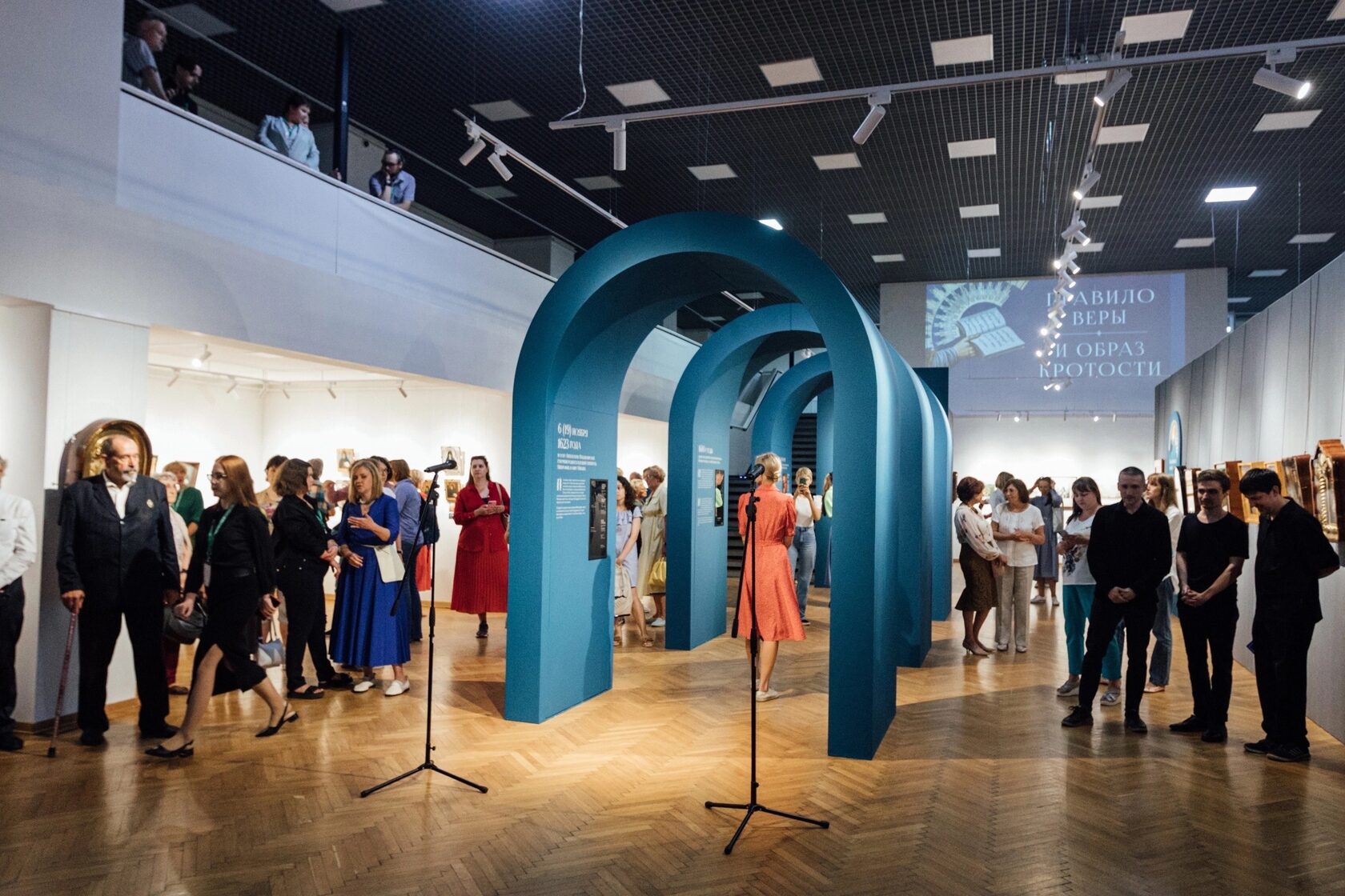 Следуя концепции, посетители начинали своё путешествие по выставке с изучения жизни святителя Митрофана, проходя через арки, символизирующие его «путь смирения». Но пространство между арками позволяло в любой момент переключиться на изучение других тем. Для удобства и лучшего понимания мы разместили информационные стенды в каждом тематическом разделе, чтобы даже незнакомые с иконописью и церковной историей люди могли легко разобраться в экспозиции.